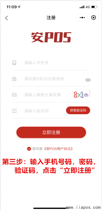 识别打开安POS小程序,点击立即注册,输入手机号码、登录密码、验证码即可完成注册。